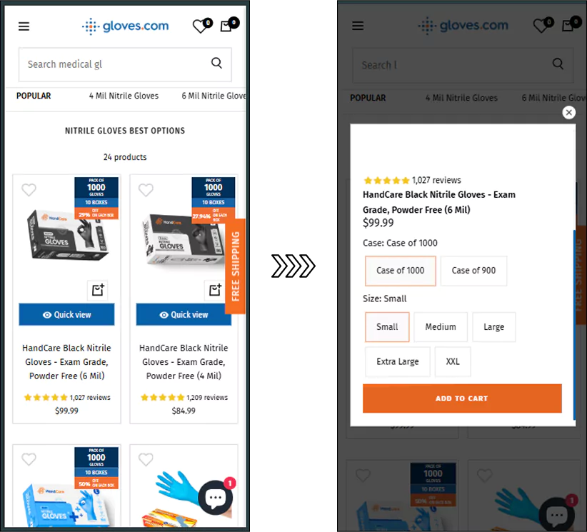 When mobile shoppers tapped a product, a card opened with essential details, zoomable images, size selectors, and a prominent "Add to Cart" button, all optimized for thumb reach and fast interaction.