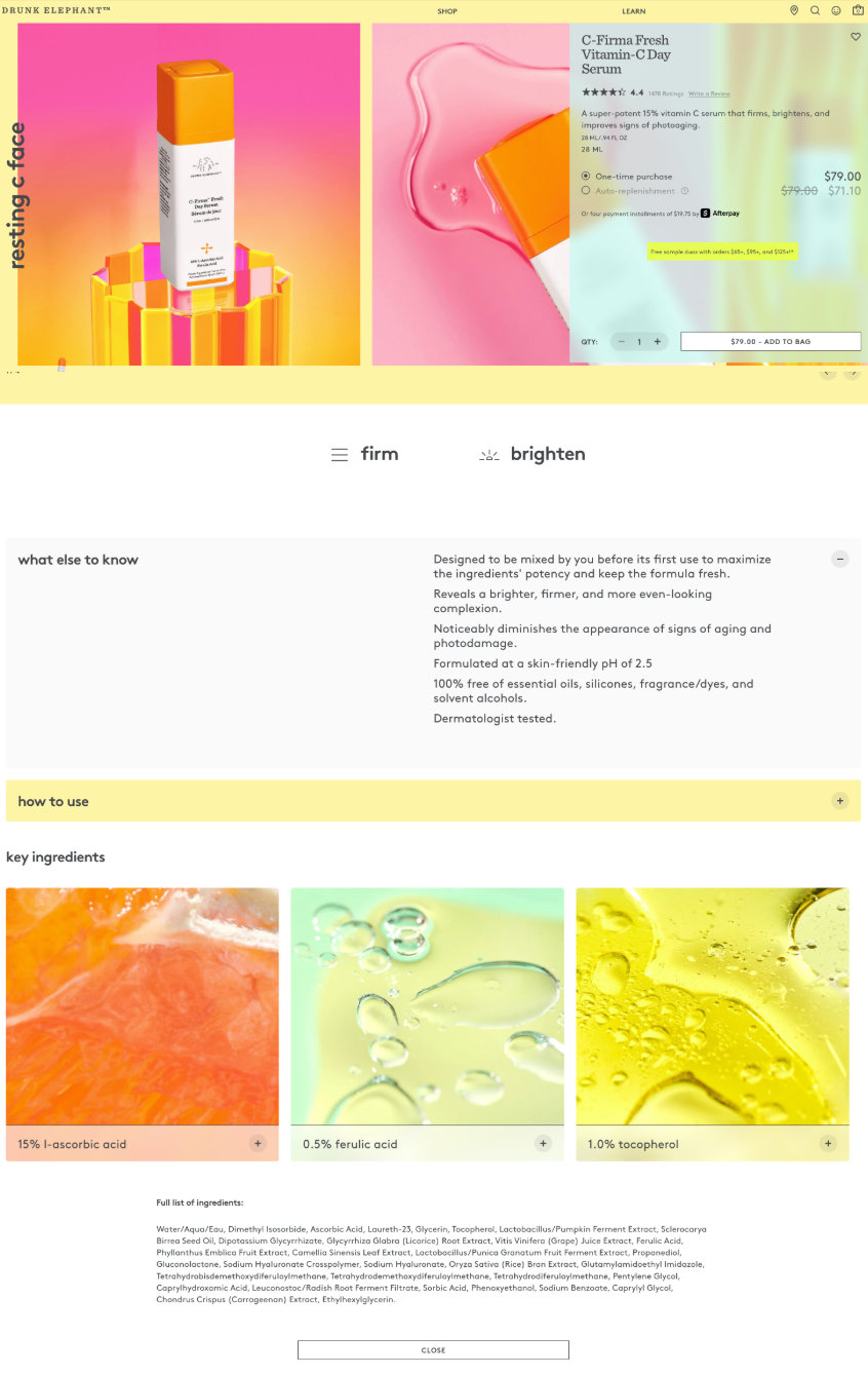 Shoppers are obsessed with full ingredient lists and explanations of key actives. The pages that really convert don’t just dump a wall of Latin names, they make ingredients the hero.