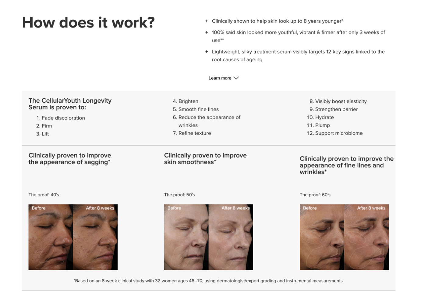 You can label them with timeframes (“after 4 weeks”) and skin types for extra relevance.