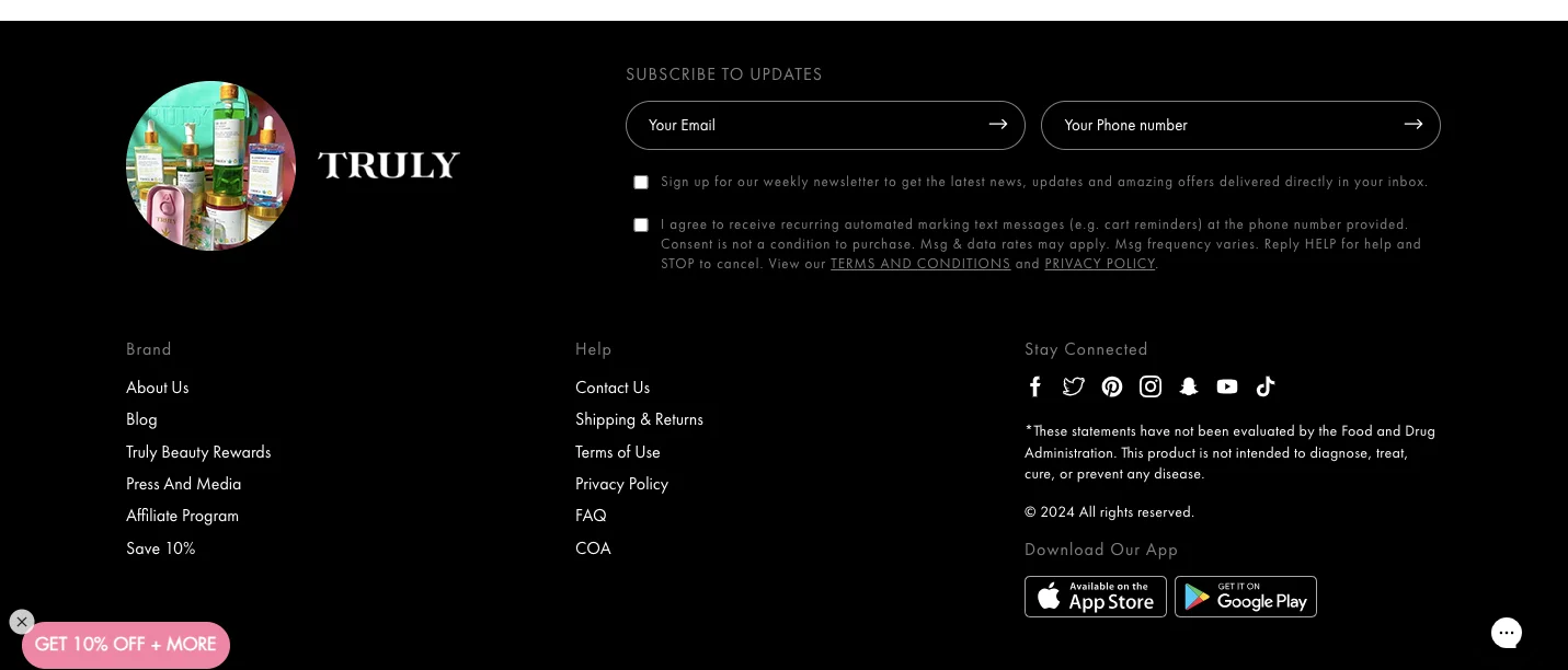 Check out how eCommerce beauty brand Truly Beauty markets their website – by keeping their footer section functional, informative, and engaging: