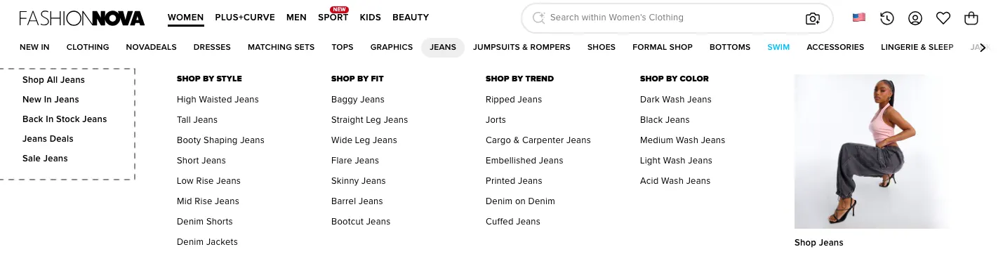 For a store with Fashion Nova's catalog size, this level of navigational precision is what separates exploration from overwhelm, and overwhelm reliably leads to bouncing.