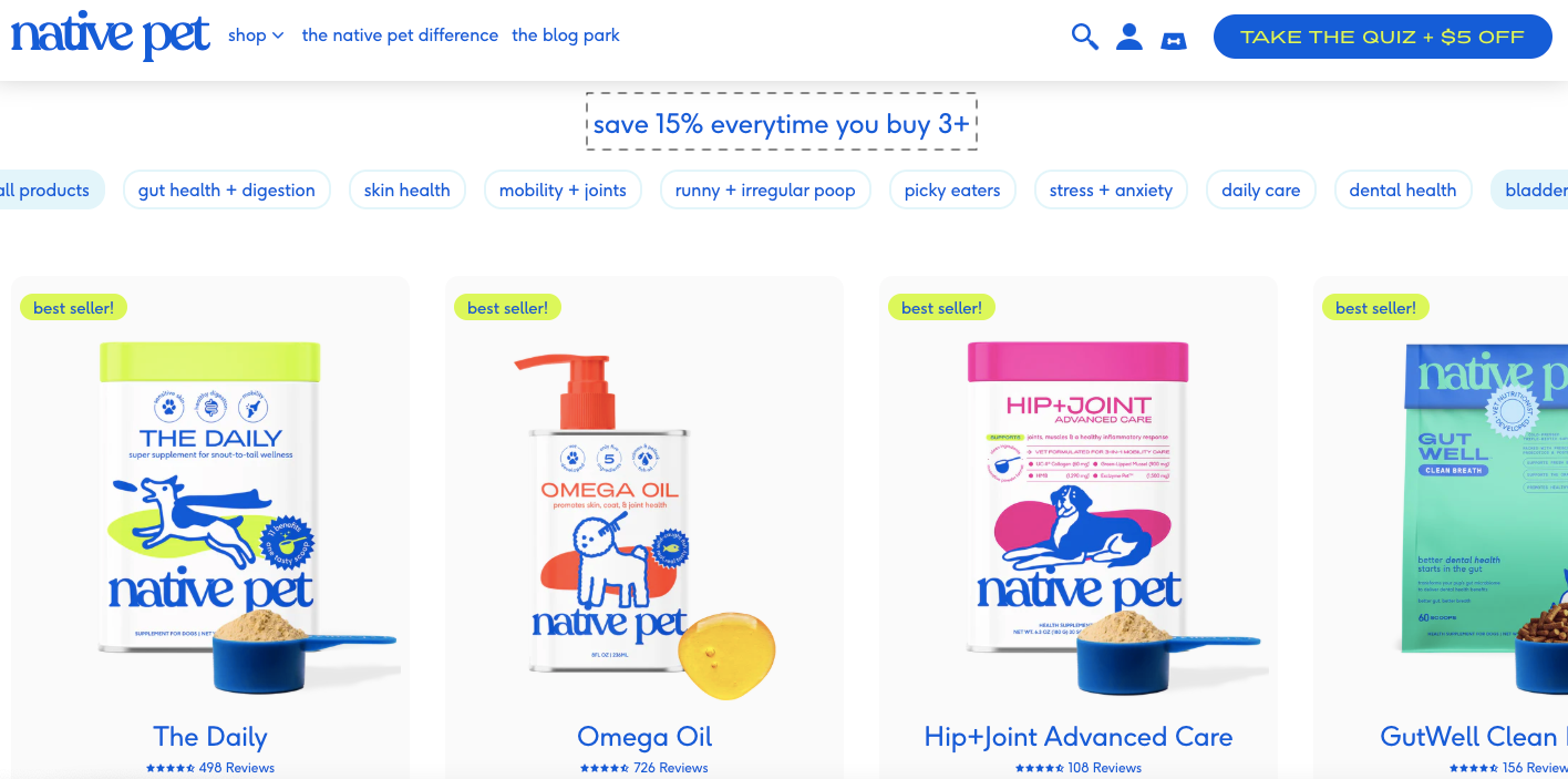 The ease of product discovery: Since tier discounts are meant to nudge people to buy more, it’s only fair that you make that process easier. Native Pet displays radio buttons on concerns that shoppers may want to click on right under the tier pricing callout.