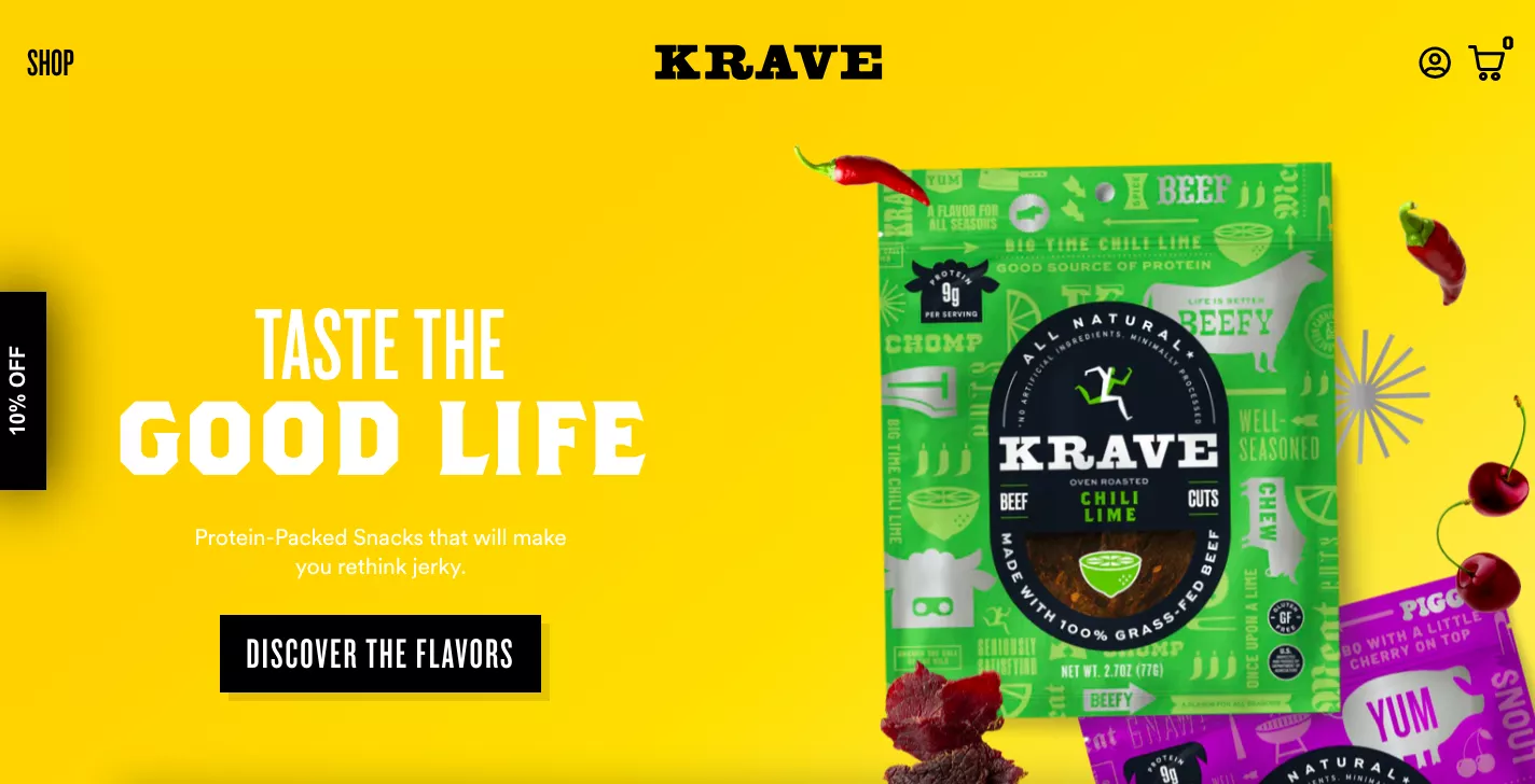 For example, in this case, there’s a catchy message saying “Taste the good life,” and then it immediately segues into explaining what they’re selling. Right? Protein-packed snacks that will make you rethink jerky. This explains what it is, but not the benefits, really. So make it extremely clear what you’re trying to do.