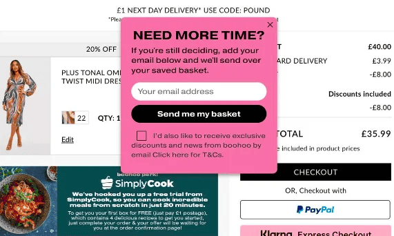 In this case, a $35 product — a dress, in that sense — and what we are asking the customer to do is save the cart for later or remind me about the product later on. So some very small things that we're trying to do. And this only pops up for exiting users — so people who are exiting the site. This is an exit intent popup.