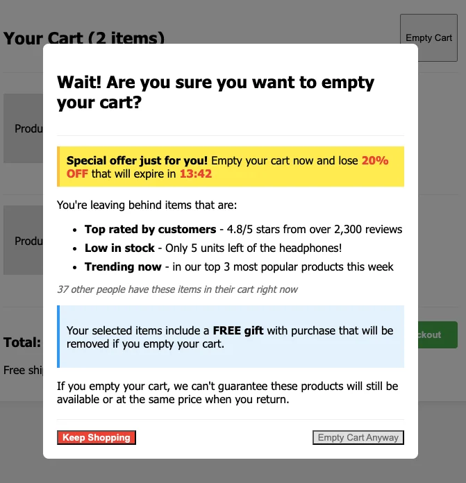 “Wait, are you sure you want to empty your cart? You’re leaving behind items that are top-rated, low in stock, trending now. Your selected items include a free gift. If you empty your cart, we can’t guarantee these products will still be available.”
