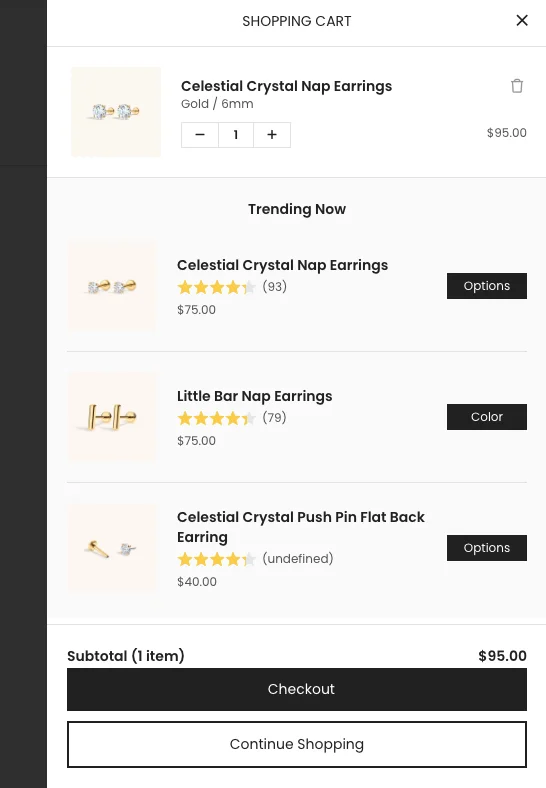 Like in this case, I’ve added a set of earrings to my cart, and I have three more suggestions that all look great and all look similar. In terms of the quality of suggestions, they’re great — but there’s no way for me to quickly add them to the cart.